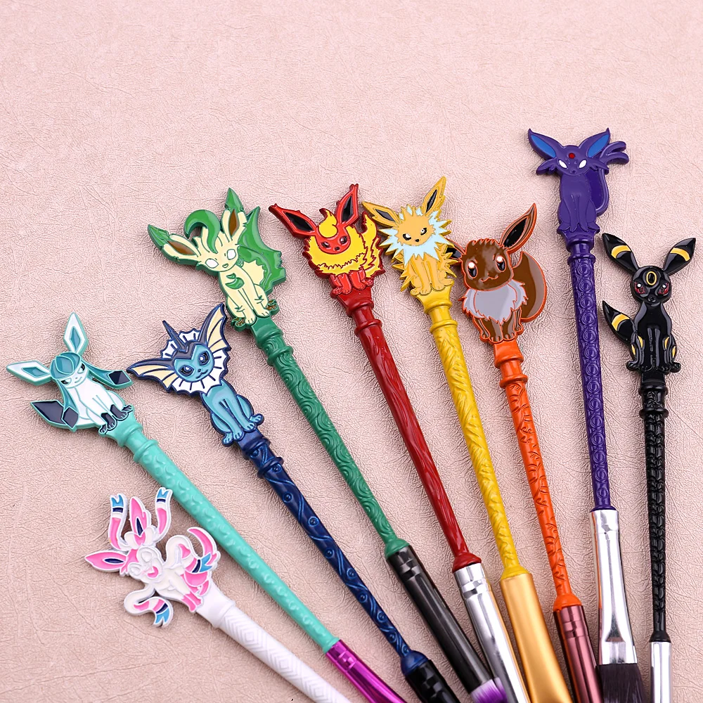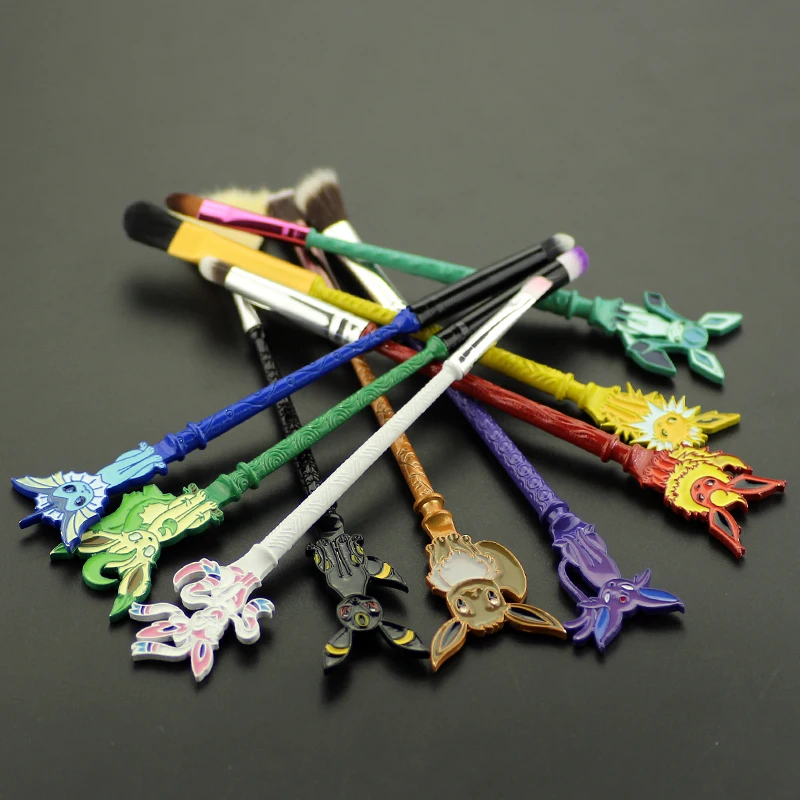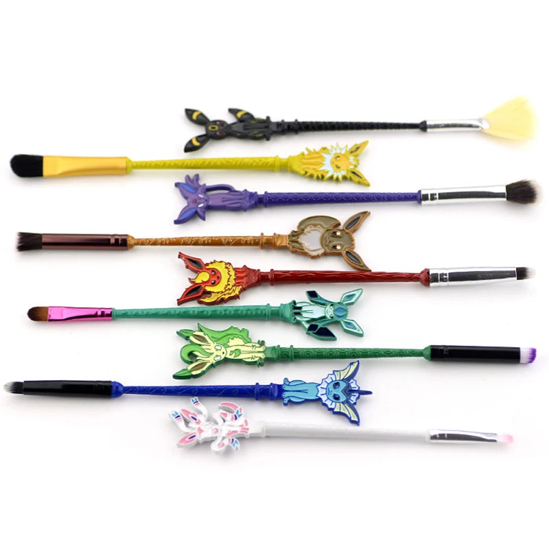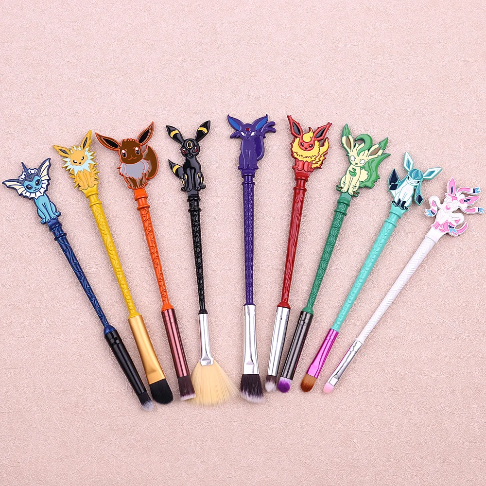 Pincéis cosméticos para base, sombra, pó, sobrancelha e lábios. Ferramentas de beleza femininas com design do personagem Eevee, ideais para maquiagem e também como item colecionável ou acessório de cosplay.