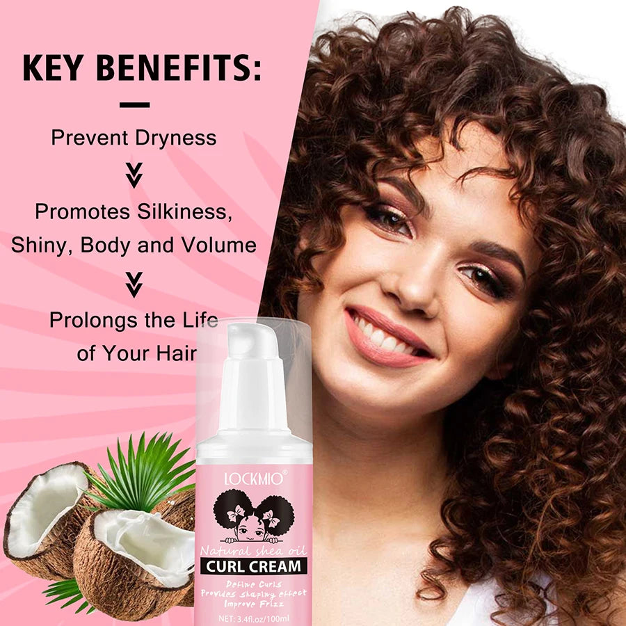 O óleo de karité natural nutre o cabelo e o couro cabeludo, melhora os cachos com suavidade, doma o frizz e os fios rebeldes, ao mesmo tempo que define cachos suaves e saltitantes.
